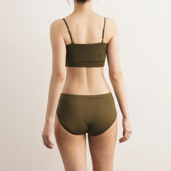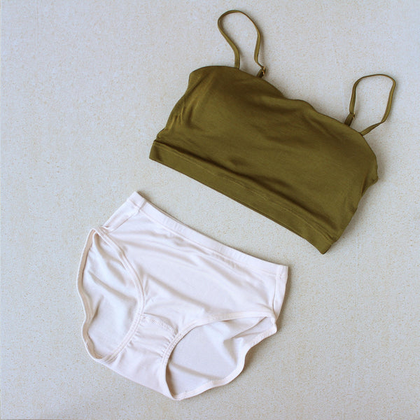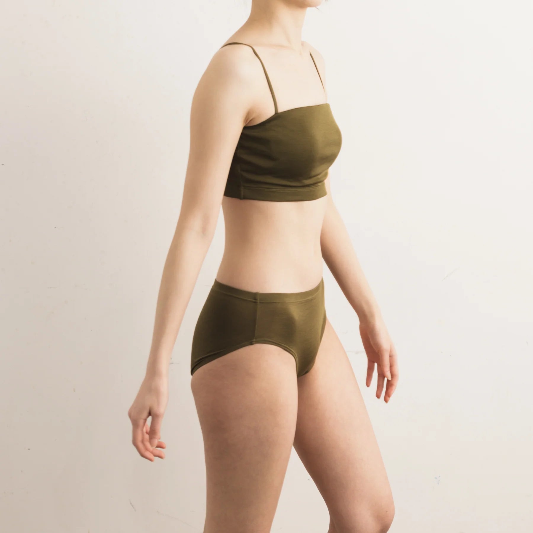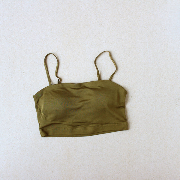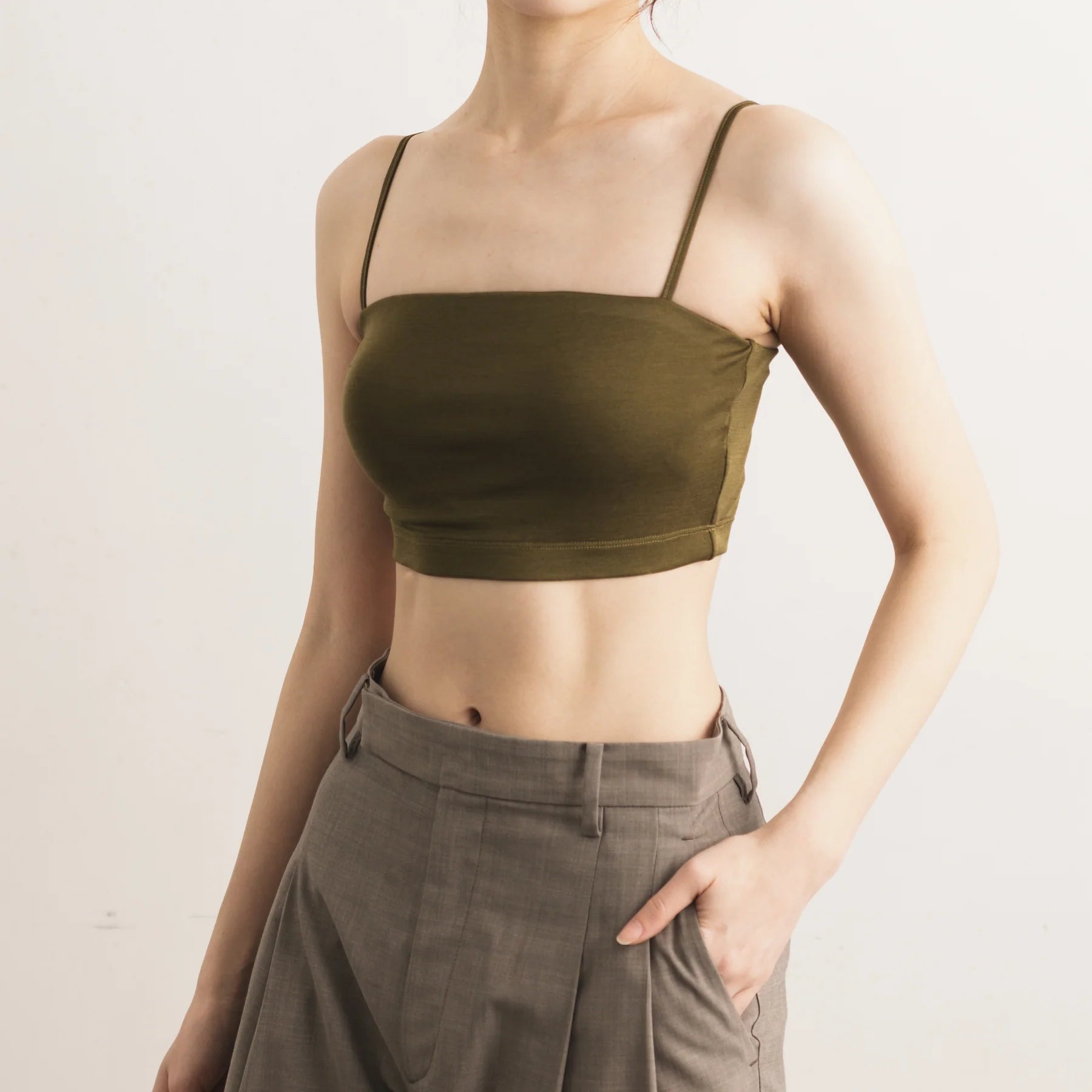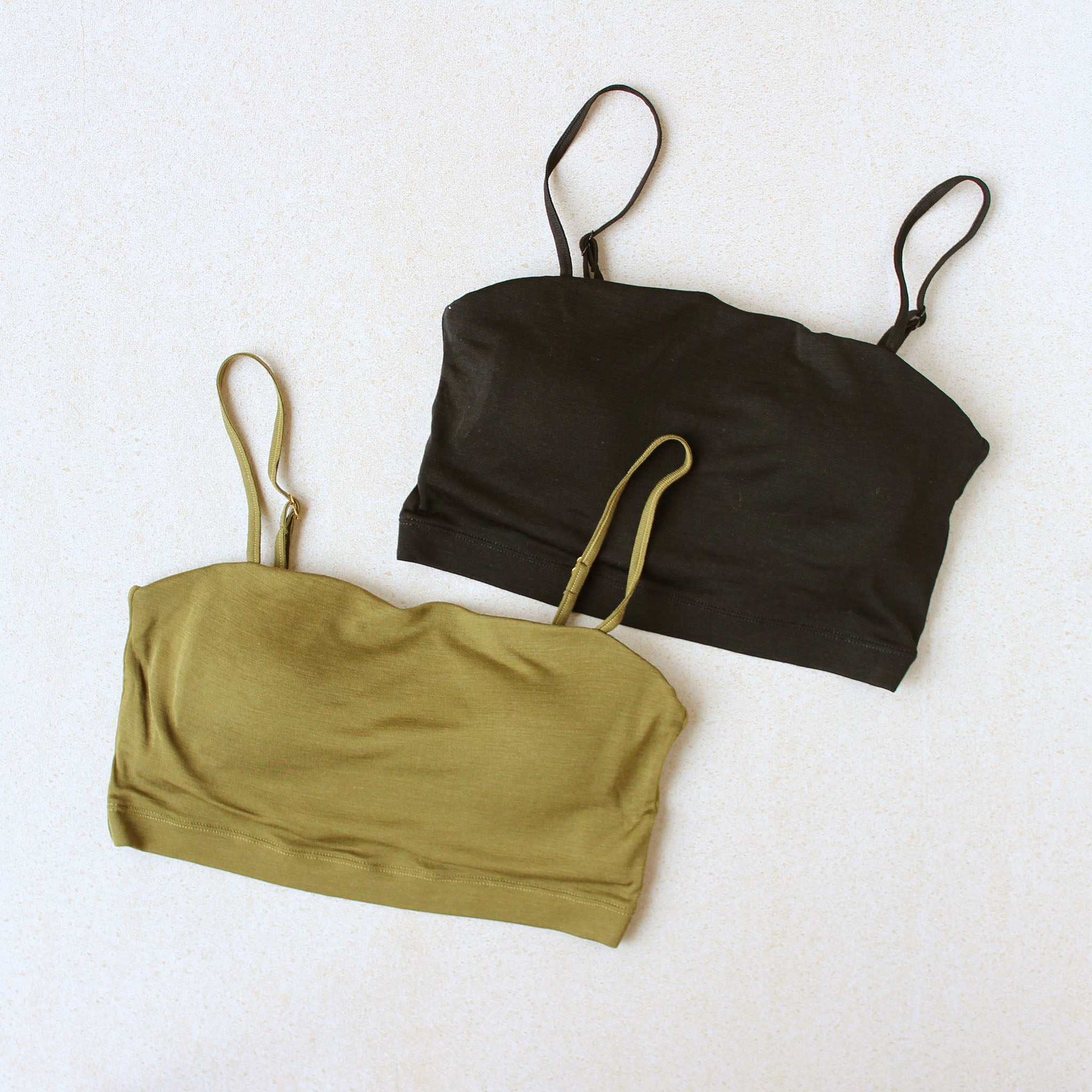 ブラよりも少しだけ長く、クロップドよりもやや短い、使いやすい丈感のバンドゥタイプブラ。