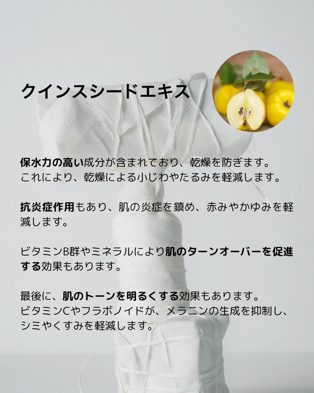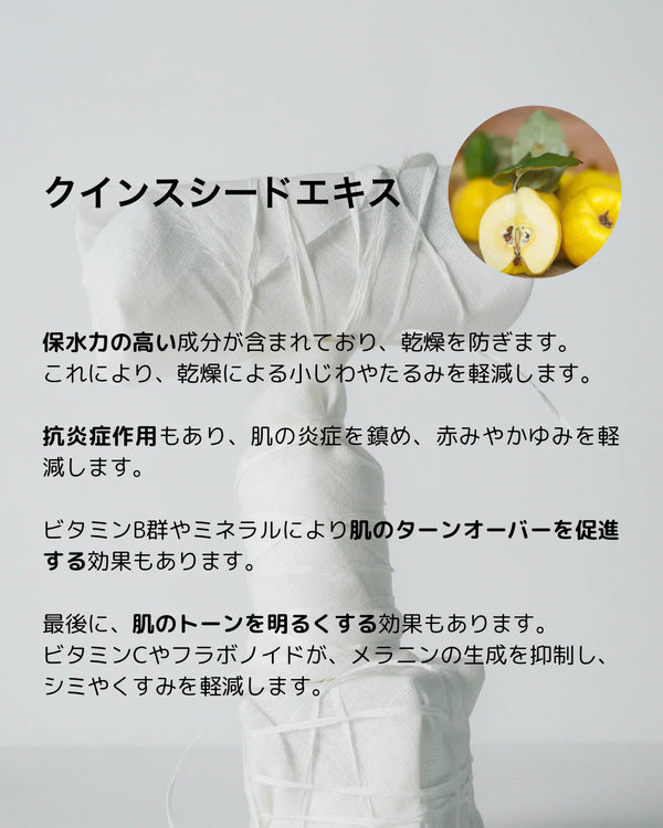 全成分 マルメロ果実水、ハス花水、クインシードエキス、BG、ヒドロキシエチルセルロース、アルギン酸Na、PEG/PPG/ポリブチレングリコールー8/5/3グリセリン、PPGー10メチルグルコース、ポリソルベート20、カプリル酸グリセリル、ヒドロキシアセトフェノン、ベチベル根油、ビターオレンジ葉/枝油、水、アオモジ果実油、トロロアオイモドキ種子油、リンゴ果実油
