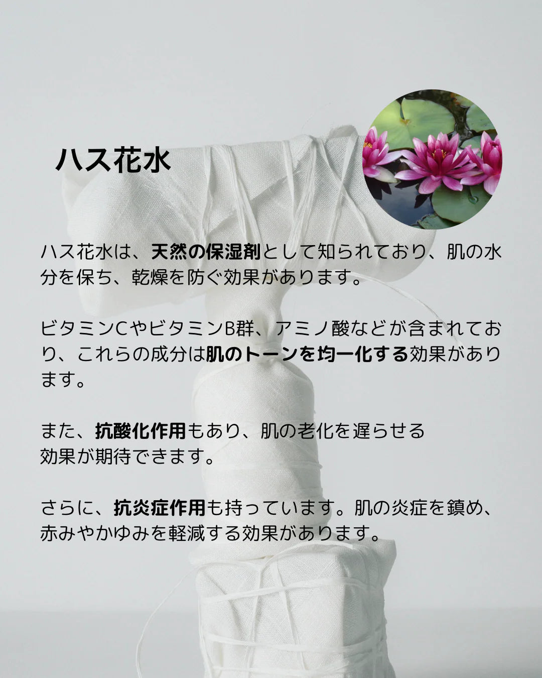 保湿と抗酸化に優れたハス花水とクインスシードエキスを使用しており
